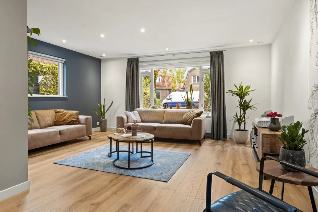 Stap binnen in een sfeer waar modern comfort en natuurlijke elegantie samenkomen. De stijlvolle woonkamer, is met zorg ingericht om u de perfecte balans te bieden tussen ontspanning en samenzijn. De combinatie van de diepblauwe accentmuur, de lichte houtlook vloer en de comfortabele banken in warme, aardse tinten creëert direct een uitnodigende en gezellige sfeer. De ruimte is zowel knus als ruimtelijk, met voldoende plek voor comfortabele zitmeubels en stijlvolle opbergoplossingen. Of u nu een gezellige avond met vrienden plant, een luie middag met een boek doorbrengt, of gewoon wilt genieten van quality time met het gezin, deze woonkamer biedt de ideale setting. De plek waar u zich direct thuis voelt.