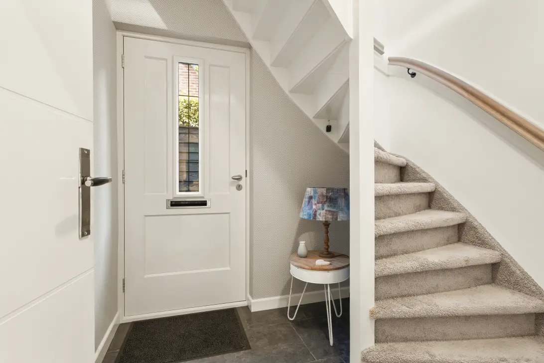 Begane grond: De lichte en uitnodigende hal heet u en uw gasten van harte welkom in uw nieuwe woning. De behaaglijke, met vloerbedekking beklede trap leidt naar de eerste verdieping en zorgt direct voor een warme en huiselijke sfeer. Het toilet bevindt zich in de hal bij de zijdeur. Daar vind je een keurig, compleet toilet met een eigentijdse tegelwand in een speels patroon van frisse grijs- en mintgroene tinten, voorzien van een praktisch fonteintje. Aan de voorzijde van de woning bevindt zich de sfeervolle woonkamer, waar het prettig vertoeven is dankzij de fijne lichtinval en de aangename sfeer.