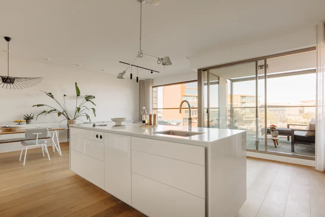 De moderne Poggenpohl-keuken met kookeiland is uitgevoerd in een luxe afwerking, voorzien van hoogwaardige inbouwapparatuur, een Quooker en een geïntegreerde wijnklimaatkast. Aansluitend bevindt zich de loggia op het westen, een comfortabele buitenkamer met middag- en avondzon. Dankzij de glazen schuiframen is deze ruimte het hele jaar door bruikbaar.