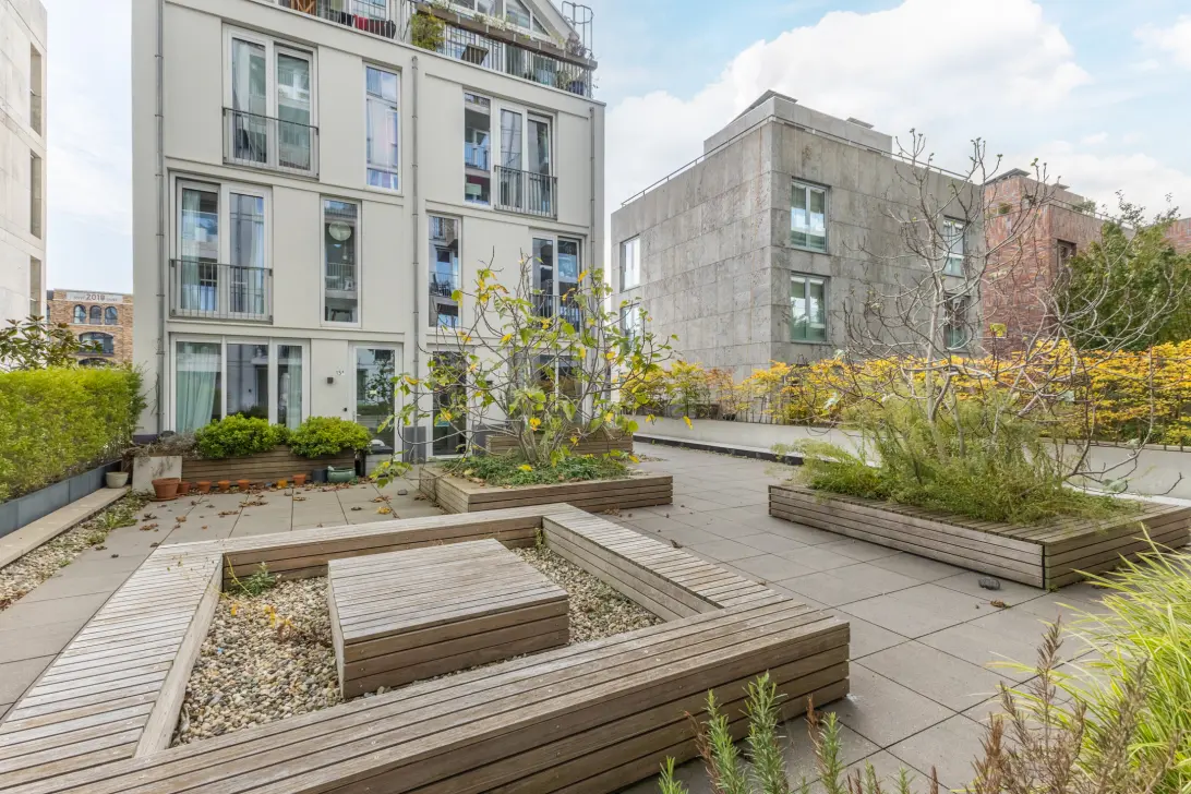 Tussen het appartementen gebouw aan de Haparandaweg en de appartementen aan de Houthavenkade ligt een gemeenschappelijke binnentuin om buiten heerlijk van de zon te genieten.