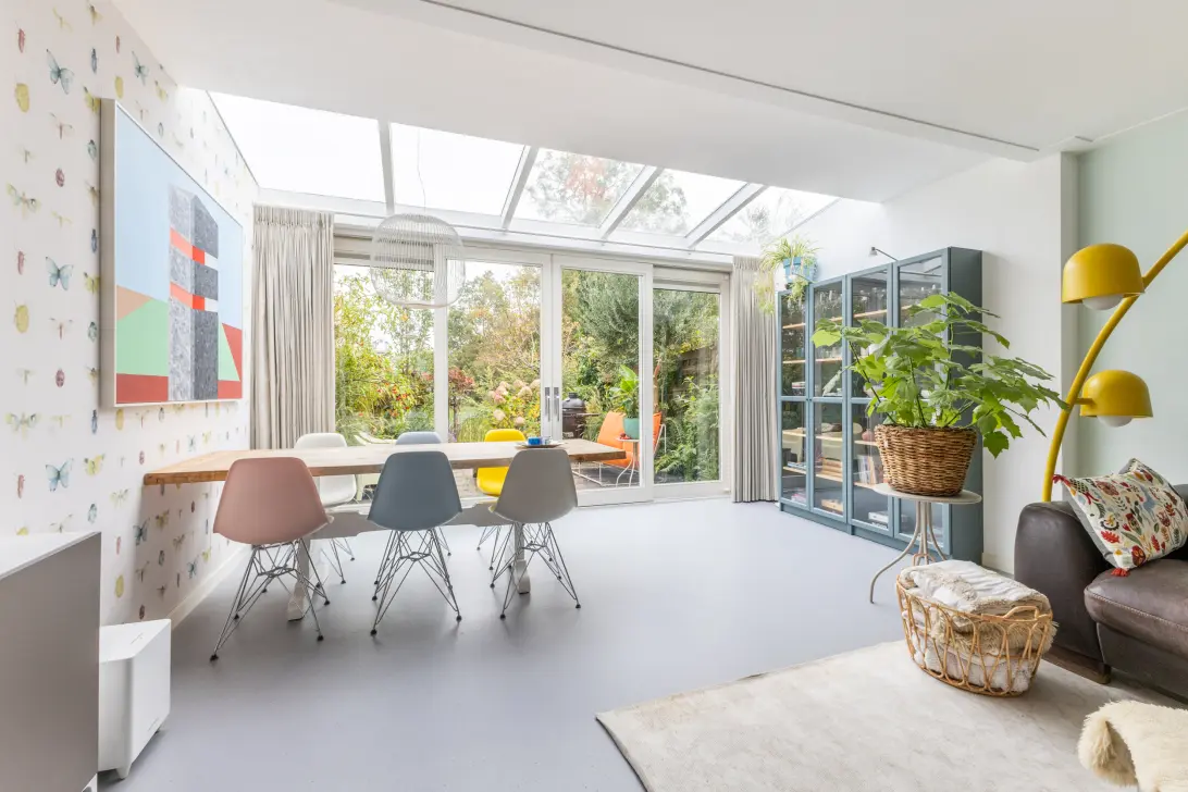 Via de voortuin met eigen oprit bereik je de entree van de woning. Direct bij binnenkomst vind je het toilet en de inpandige berging met voldoende ruimte voor fietsen en tuinspullen. Vanuit de hal stap je de ruime en lichte woonkamer binnen - een heerlijke leefruimte waar direct een gevoel van rust en ruimte ontstaat. In 2018 is de woning aan de achterzijde uitgebouwd, waarbij een grote schuifpui naar de tuin is geplaatst en een prachtige lichtstraat is gecreëerd, waardoor de woonkamer extra licht is. De gehele begane grond is voorzien van een marmoleum vloer met vloerverwarming, wat zorgt voor een strak en comfortabel geheel.