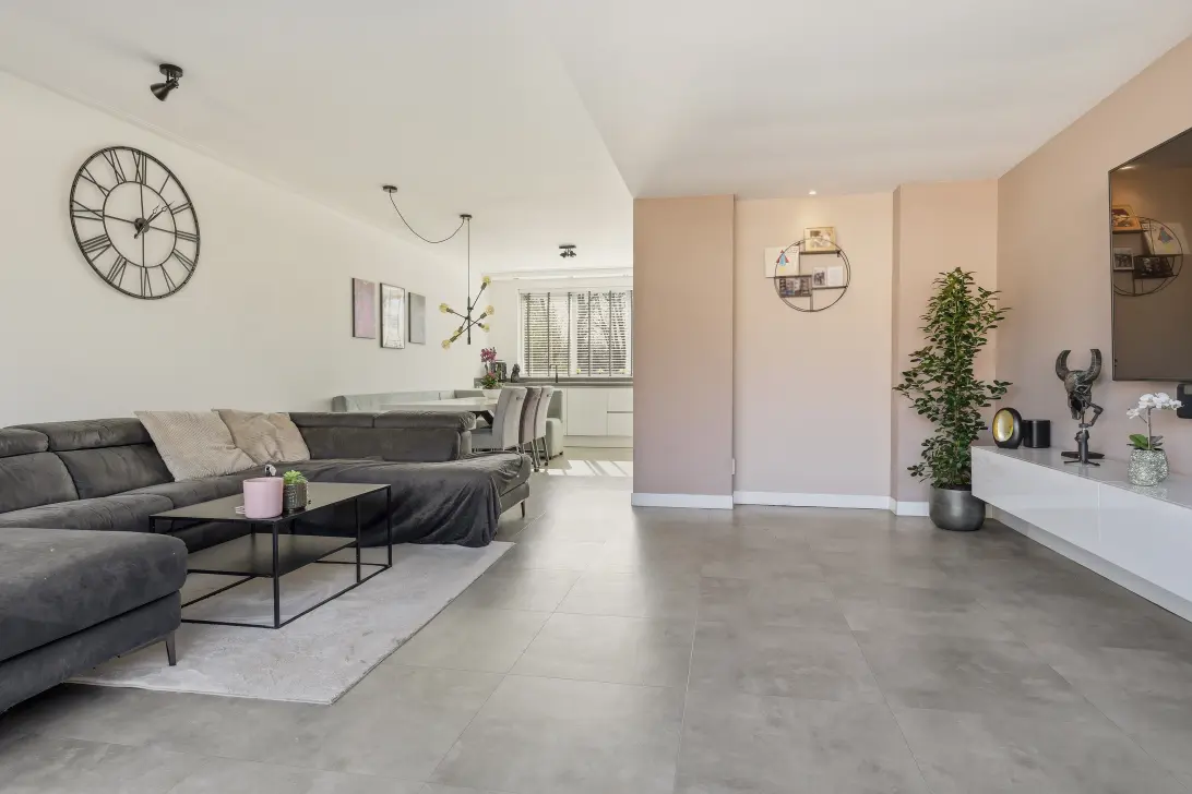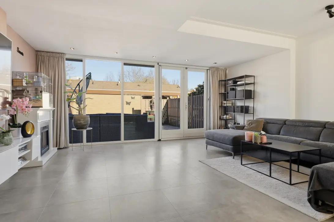 Via de verzorgde voortuin kom je bij de entree van de woning. In de hal valt direct de nette en moderne afwerking op. De muren zijn strak gestuukt en de vloer is voorzien van een stijlvolle PVC-vloer met vloerverwarming, wat zorgt voor extra comfort. Via de statige deur loop je door naar de woonkamer. In 2018 is de woning aan de achterzijde flink uitgebouwd, waardoor er een zeer ruime en lichte leefruimte is ontstaan van maar liefst 60 m². De grote glazen achterpui met openslaande deuren zorgt voor veel daglicht en een mooie verbinding met de tuin. Hier heb je meer dan voldoende ruimte voor een royale bank en een gezellige zithoek.