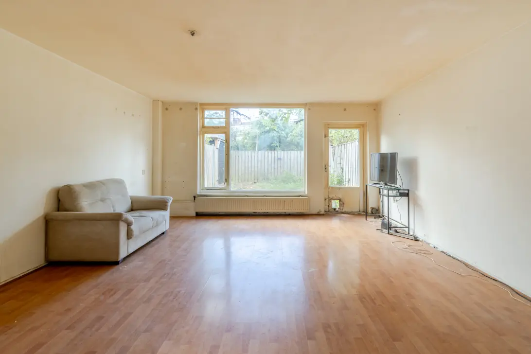 Je komt binnen via een ruime hal met toegang tot de meterkast, het toilet en de trap naar boven. De lichte woonkamer heeft grote ramen en kijkt uit op de tuin. Aan de voorzijde vind je de keukenruimte. Op dit moment staat hier alleen een los gasfornuis - de rest van de keuken moet nog volledig worden geplaatst. Dit biedt de perfecte kans om zelf een nieuwe, moderne keuken te realiseren die helemaal aansluit bij jouw wensen. Vanuit de woonkamer stap je zo de zonnige achtertuin in, waar je van ‘s ochtends tot ‘s avonds van de zon kunt genieten.