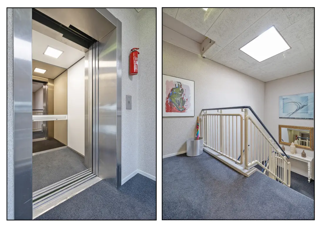 De appartementen zijn bereikbaar via de centrale ingang gesitueerd aan de straatzijde van het gebouw; hier bevinden zich de intercom, brievenbussen, trappenhuis en lift installatie. De bergingen staan achter het gebouw.