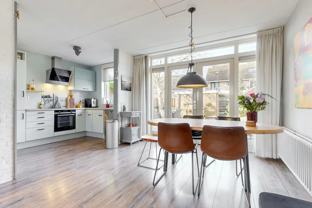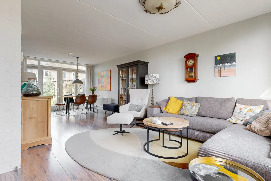 De indeling van deze hoekwoning : hal met meterkast en toilet, lichte woonkamer met een half open hoek opgestelde keuken met een oven, koel/vries combinatie, vaatwasser en een inductie kookplaat (2023). Via de openslaande deuren komt u uit bij de brede achtertuin met een stenen berging.
