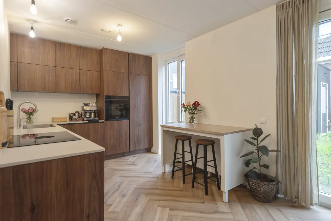 De woonkamer is ruim en licht, met daglicht van twee kanten. Hierdoor voelt de ruimte open en uitnodigend aan. Via de grote openslaande deuren stap je zo de tuin in – een heerlijke buitenruimte van maar liefst ca. 77 m², gunstig gelegen op het zuiden. Dat betekent de hele dag zon, midden in de stad. De tuin is volledig naar eigen smaak in te richten. Extra praktisch is de aanwezige fietsenberging – een zeldzaamheid op zo’n centrale locatie. Aangrenzend aan de woonkamer ligt de keuken, geplaatst in 2025 – en dat is meteen een eyecatcher. De combinatie van een licht werkblad met warme, donkerhouten kastfronten zorgt voor een luxe uitstraling. Uiteraard voorzien van topapparatuur: een Bora-inductiekookplaat met geïntegreerde afzuiging, Quooker-kraan, Miele combi-oven en een vaatwasser. Het gezellige barretje maakt dit de ideale plek om te koken, te borrelen en samen te komen.