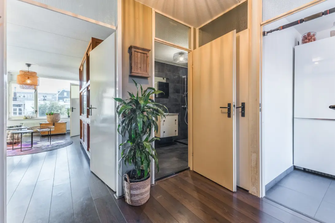 Via de afgesloten entree komt u in de centrale hal met trappenhuis, lift en toegang naar de bergingen. Op de verdieping aangekomen treffen we de voordeur en meterkast voorzien van moderne automaten aan. Er zijn 2 slaapkamers, dichte moderne keuken voorzien van inbouwapparatuur, separaat hangcloset en moderne badkamer met wasmachine/drogeraansluiting. De woonkamer is heerlijk licht en aan deze kant bevindt zich ook het zonnige balkon.