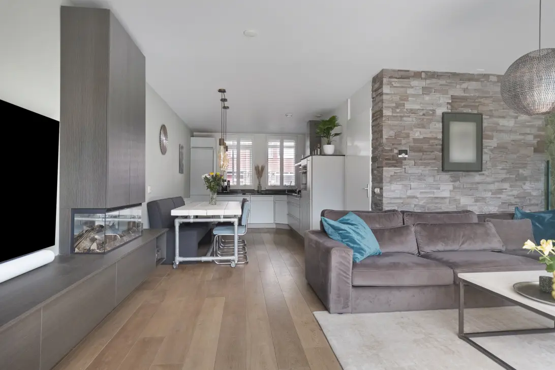 - Tuingerichte woonkamer met grote schuifpui (2025, HR++) en houten lamelparketvloer
