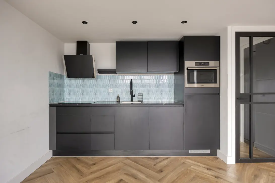 Het zwarte luxe keukenblok is voorzien van een marmerlook hardstenen werkblad en veel praktische bergruimte in de laden en kasten. Daarnaast beschikt het over een 4-pits inductieplaat (Whirlpool) met een zwarte afzuigkap (Zanussi), koelkast met vriesgedeelte, een vaatwasser, combioven, spoelbak en close-in boiler.