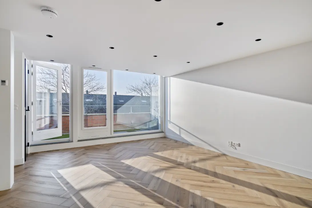 De slaapkamer aan de voorzijde valt direct op door het hoge plafond en de woningbrede raampartij, waardoor er veel natuurlijk licht binnenvalt. Daarnaast zorgt een lichtkoepel voor extra daglicht en een aangename frisse sfeer, wat deze kamer bijzonder richt en ruimtelijk maakt. Door deze prettige hoogte is hier tevens voldoende ruimte voor een hoogslaper/slaapvide. De tweede slaapkamer ligt aan de achterzijde en beschikt eveneens over een fraaie raampartij. In deze kamer is bovendien het vloerverwarmingssysteem geplaatst, wat zorgt voor een comfortabele warmteverdeling.