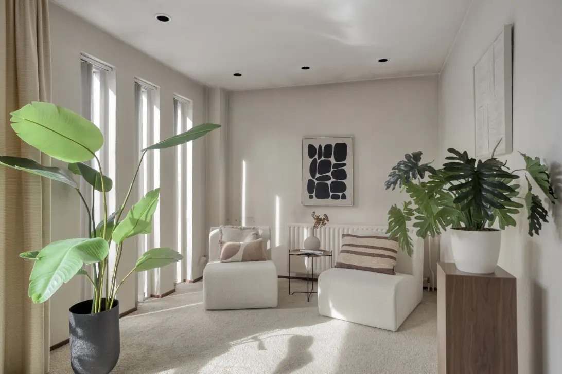 Op de begane grond vind je een ruime woonkamer met een speelse maar prettige indeling. Aan de voorzijde bevindt zich het zitgedeelte met grote raampartijen van vloer tot plafond, waardoor er veel natuurlijk licht binnenkomt. Aan de achterzijde, met uitzicht op de tuin, is het eetgedeelte met keuken. Via zowel de loopdeur als de schuifpui heb je direct toegang tot de privacy-volle achtertuin.