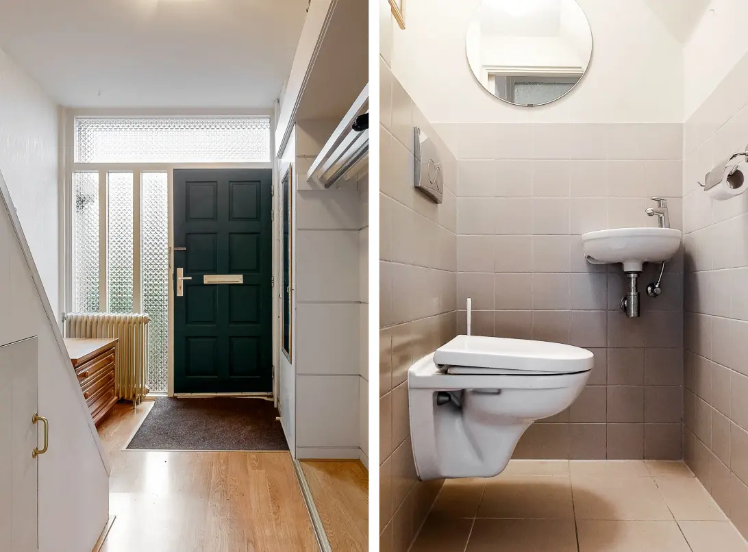 Via de voortuin komt u bij de entree van de woning. In de hal bevinden zich de meterkast, de trapopgang en het toilet met fonteintje. Tevens is er een praktische trapkast met genoeg bergruimte.