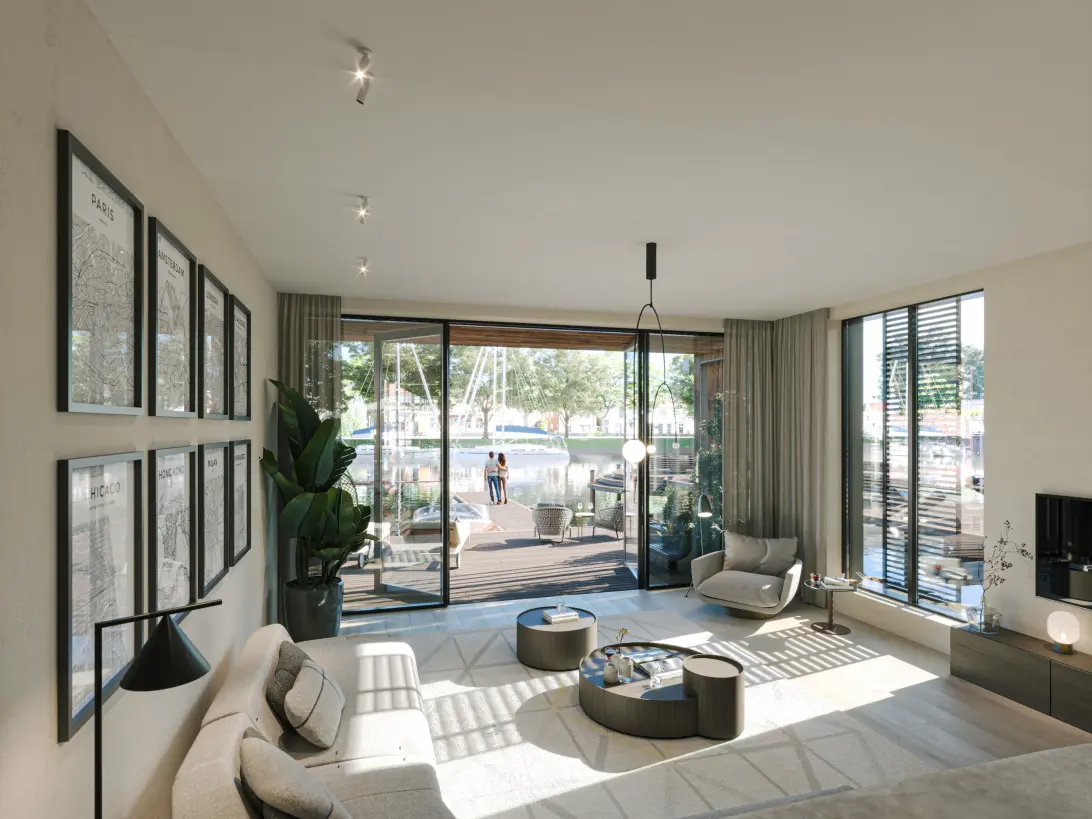 Binnen en buiten lopen hier moeiteloos in elkaar over. De living vormt het hart van de woning, subtiel verdiept voor een intieme sfeer en prachtig uitzicht op het water. Openslaande deuren verbinden de woonkamer met het terras en de privé aanlegsteiger van circa 12 meter (erfpacht). Aan de achterzijde ligt de tuin aan de werf, bereikbaar vanuit de keuken.
