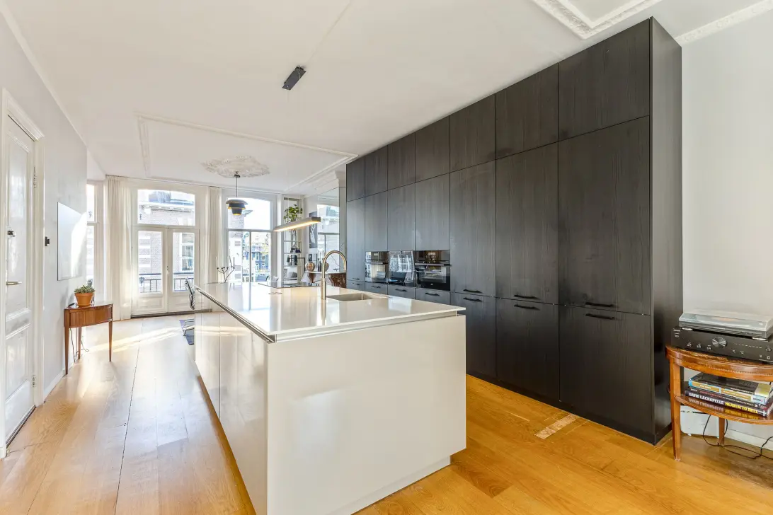 Het hart van de woning is de royale keuken met groot kookeiland. Een plek waar je makkelijk vrienden ontvangt, uitgebreid kookt of juist met een kop koffie begint, met aan de voorzijde het klassieke eetgedeelte met in de hoek een werkruimte (waar eenvoudig door het plaatsen van een muurtje een werkkamer van gemaakt kan worden) én het charmante tea-for-two balkon op het oosten. Hier pak je ’s ochtends de eerste zonnestralen mee, terwijl je uitkijkt over de rustige straat.