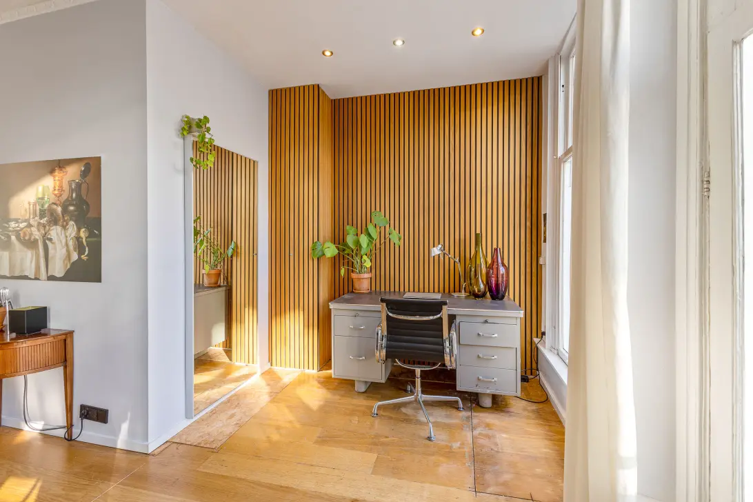 At the heart of the home is the generous kitchen with a large island: an inviting place to cook, entertain or simply start your day with a cup of coffee. At the front you’ll find the dining area with in the corner a workspace (which can easily be closed off by placing a wall for a separate office) and the charming east-facing tea-for-two balcony, where you can enjoy the morning sun while overlooking the quiet street.