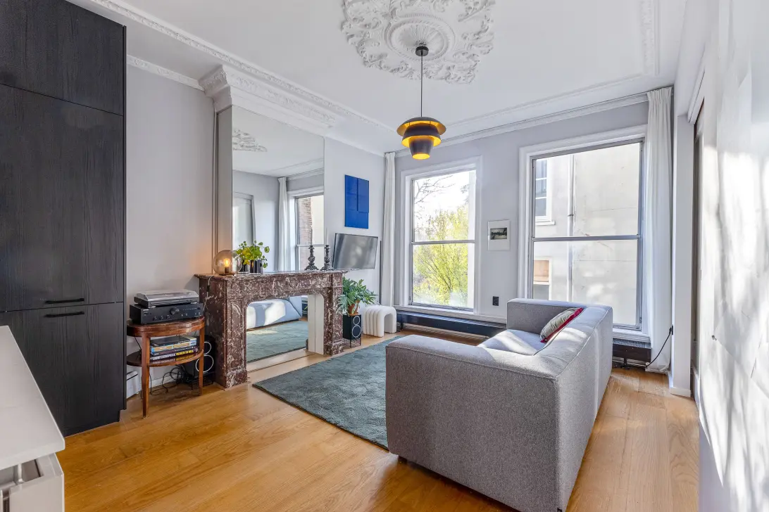 - Charming details such as two beautiful mantels, high ceilings with ornaments, wooden panel doors and an oak floor;