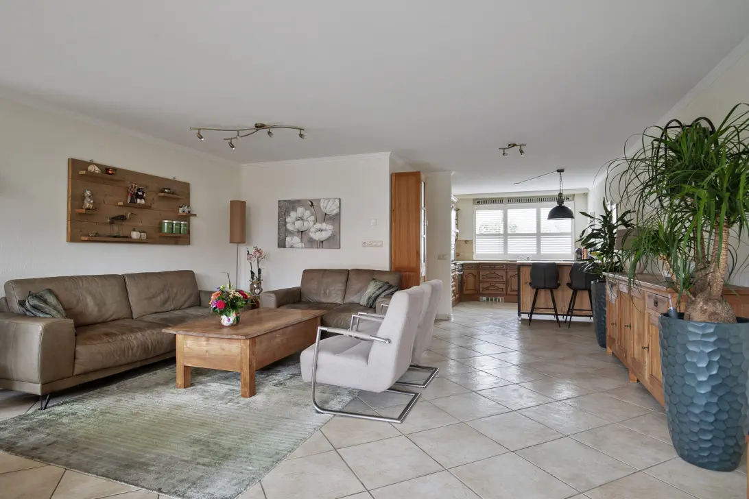 From the front entrance you enter a hallway with a wardrobe, the renovated toilet (matching the design of the new bathroom), a storage cupboard with additional space, the meter cupboard, the staircase to the first floor, and access to the open kitchen and living room. The open kitchen at the front is spacious and features various built-in appliances including a dishwasher, an induction cooktop, an extractor hood, an oven, a microwave, and a fridge-freezer combination. A large kitchen window with shutters looks out onto the attractive front garden. The spacious, extended living room boasts a fixed cupboard in the extension and a large glazed rear façade, ensuring plenty of natural light.