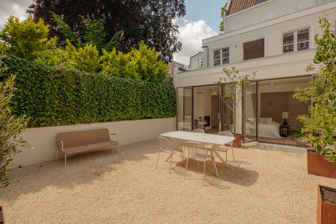 Walk through the hallway, topped with a full glass ceiling fitted with sun-reflective glass, where you’ll find a dedicated utility room (boiler, washer, and dryer), leading to the master suite in the rear house. This luxurious space features a gas fireplace with cozy sitting area, ample space for a walk-in wardrobe, and a beautifully finished ensuite bathroom with freestanding bathtub, walk-in shower, double vanity, and separate toilet. All fittings are brass, and the walls and floors are finished in natural marble. French doors also open to the garden, and there’s room for a desk or home office setup. Prefer to sleep at the front of the house? The current living space could easily become your master suite, or divide the current master into two bedrooms.