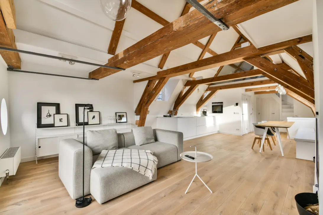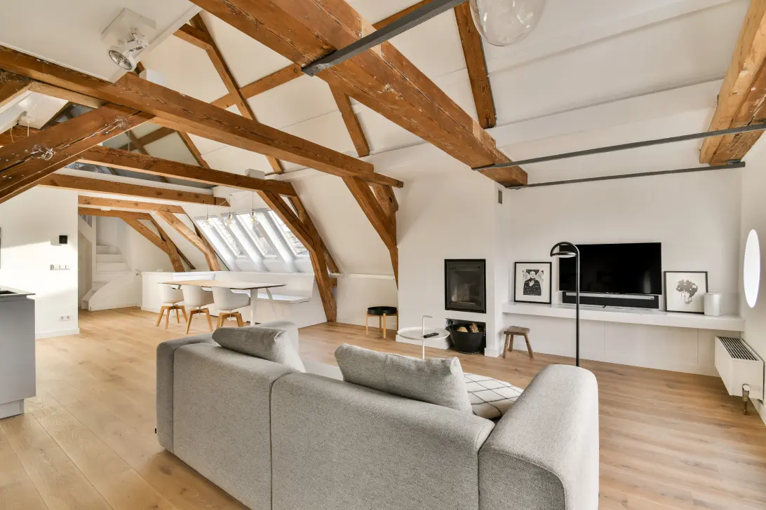 De lichte woonkamer aan de voorzijde beschikt over grote raampartijen en openslaande deuren met Frans balkon en een fraai uitzicht over de gracht. De indrukwekkende plafondhoogte van ruim 4 meter, de zichtbare balken en de open haard zorgen voor een unieke sfeer, met een bijzonder kunstobject van Alex de Witte, de “big bubble” lamp. De verwarming en het audiosysteem bedien je via je telefoon of iPad. In de woonkamer is een dressoir geplaatst van ‘string furniture’.