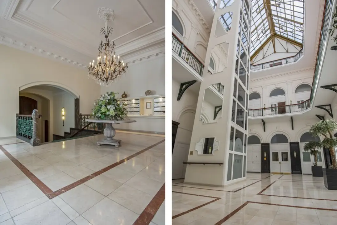 Via de imposante monumentale hoofdentree en royale hal met een plafondhoogte van bijna 5 meter bereikt men het atrium waar ook de entree van het appartement zich bevindt.
