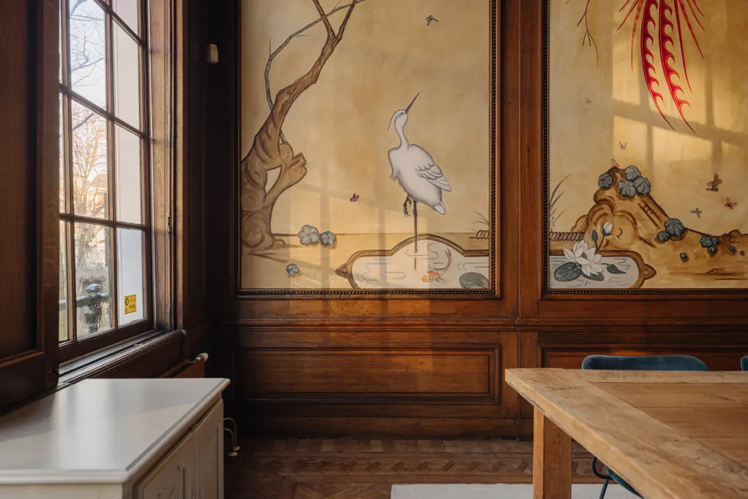 Het pand heeft een entree op stoepniveau en op de bel-etage, die toegang biedt tot een lange gang met marmeren vloeren en lambriseringen. De gang leidt naar een indrukwekkend trappenhuis dat het voor- en achterhuis verbindt en toegang geeft tot de patio. De kamer en suite is voorzien van prachtige detailleringen, unieke schouwen, muurschilderingen en hoge plafonds met grote ramen die uitkijken over de gracht. De achterkamer heeft een bijzondere schouw met witjes en een zeldzaam "cabinet secret" met neoklassieke ornamenten. Deze verborgen opbergruimtes dienden voor waardevolle voorwerpen of religieuze beeldjes.