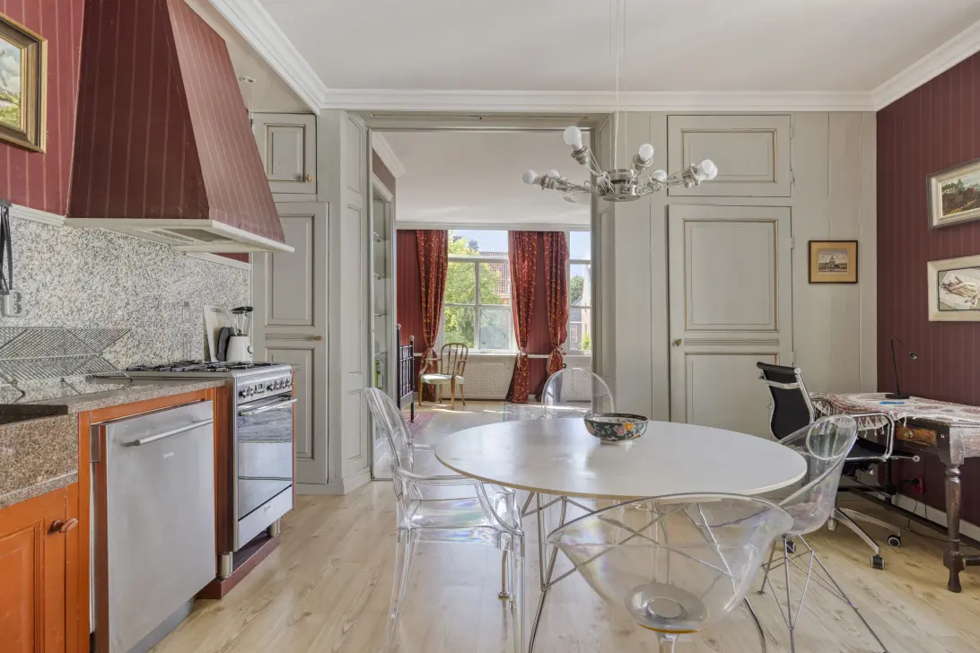 Binnenkomst in een hal. Vanaf hier zijn de verschillende vertrekken toegankelijk. De woonkamer straalt de charme van het monumentale grachtenpand uit, met zijn karaktervolle indeling en een prachtig uitzicht over de gracht. Dankzij de en suite verbinding met de eetkamer en keuken ontstaat een sfeervol geheel, ideaal voor zowel dagelijks gebruik als om gasten te ontvangen.