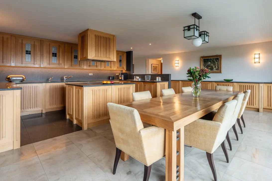 The modern kitchen is equipped with high-quality Siemens built-in appliances, including a 4-burner induction cooktop with extraction, oven, microwave, Quooker, dishwasher, and a separate fridge/freezer combination.