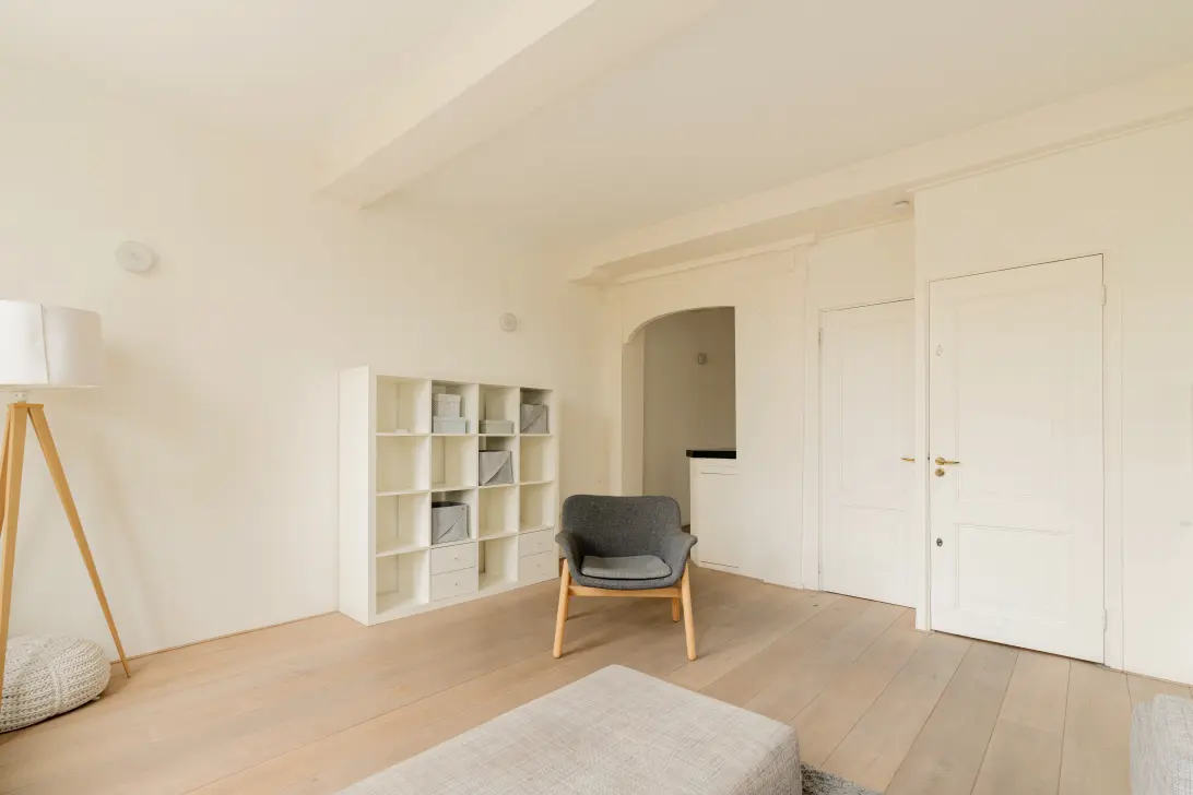 Het appartement is smaakvol afgewerkt met een lichte, geïsoleerde massief houten vloer, strak gestucte wanden en plafonds met zichtbare balken. Alles is met grote zorg onderhouden.