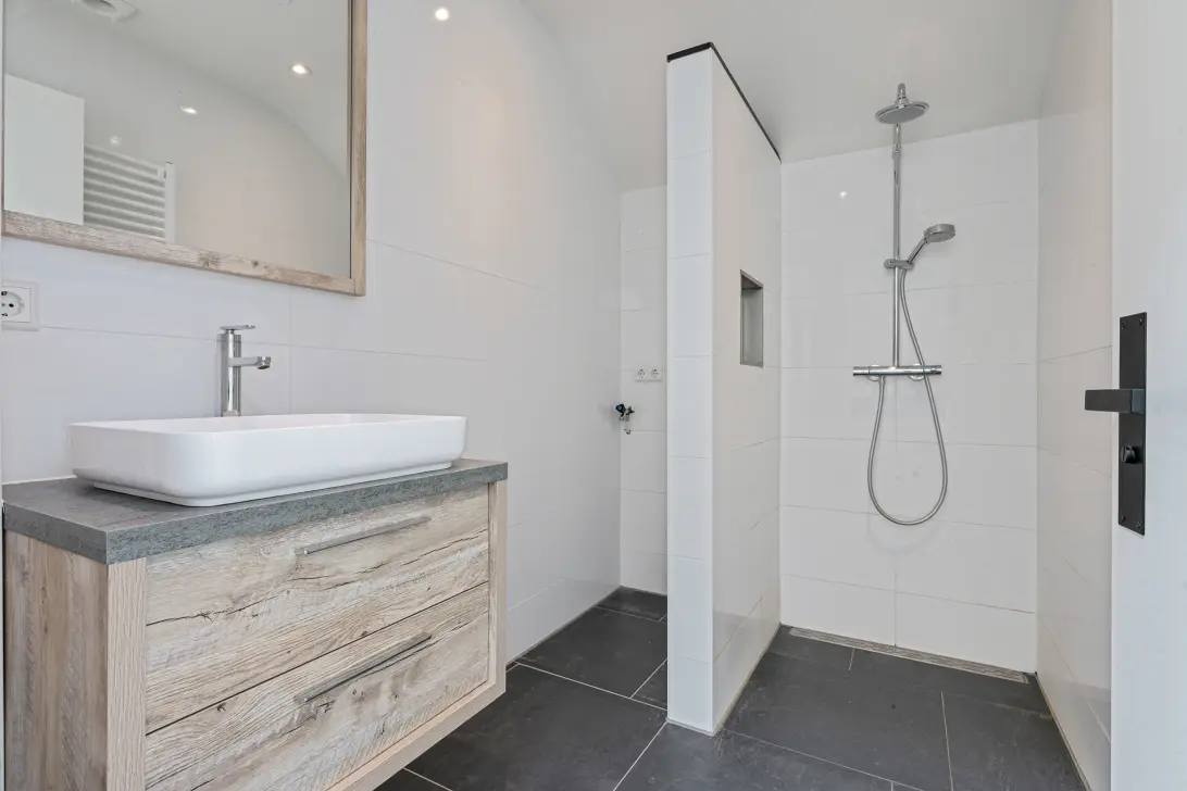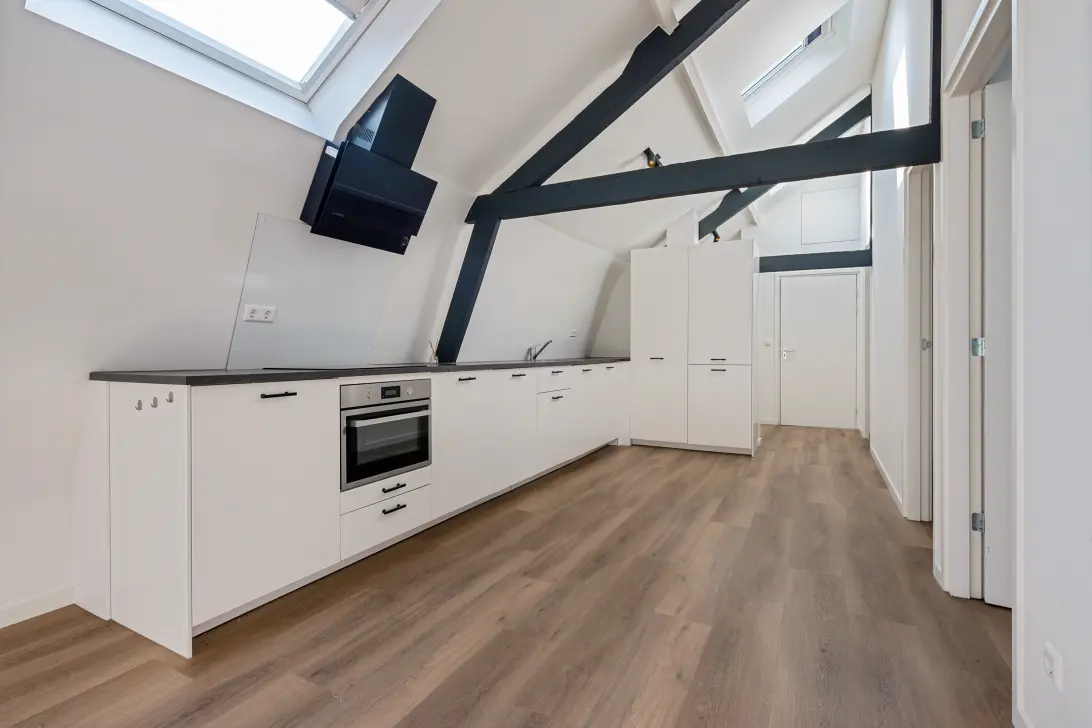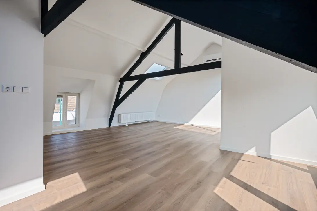 1e VERDIEPING: overloop met meterkast, deur naar hal met toilet en toegang tot de moderne badkamer voorzien van inloopdouche, wastafelmeubel, designradiator en aansluitingen voor wasmachine en droger. Via de hal tevens toegang tot de ruime en lichte woonkamer met veel ramen, hoge plafonds onder de kap en de oorspronkelijke spanten in het zicht, schuifpui naar het balkon op het zuiden (ca. 6 m²), moderne open keuken met onder meer vaatwasser, koel-/vriescombinatie, inductie-kookplaat, combimagnetron en afzuigkap. De twee slaapkamers, van ca. 10m2, zijn ook lekker licht en mooi vierkant qua opzet.