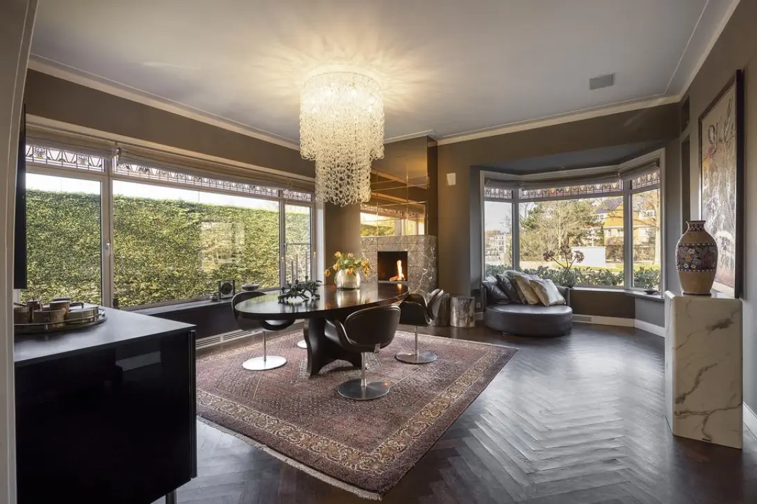 De ruime en lichte en-suite woon- en eetkamer zijn voorzien van een openhaard, glas-in-loodramen en een houten visgraatvloer. Aan de zijkant van het huis een fraai serre met dubbel openslaande deuren naar de tuin. De serre zorgt voor een speelse eenheid tussen binnen en buiten.