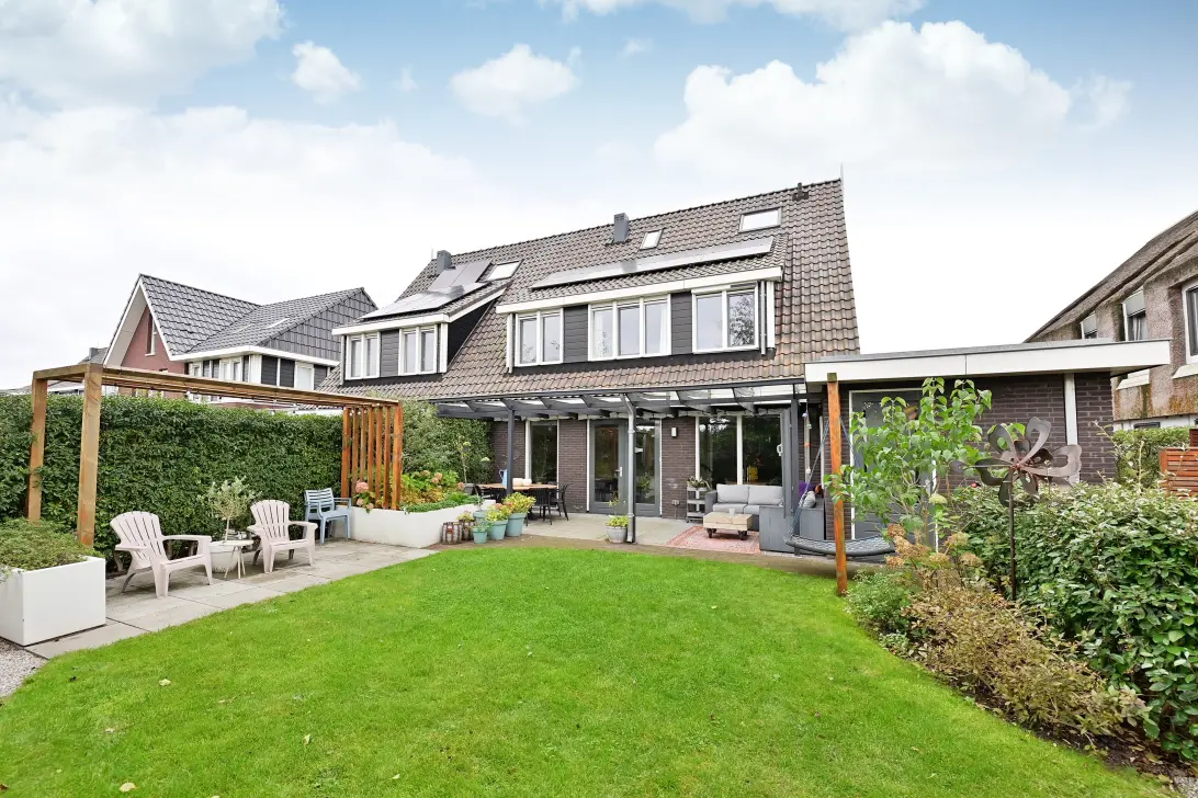 Naast de woning bevindt zich een aangebouwde stenen garage met volop ruimte voor fietsen, opslag of hobby. De voortuin biedt een zonnig terras voor de ochtendkoffie en een oprit met parkeergelegenheid op eigen terrein.