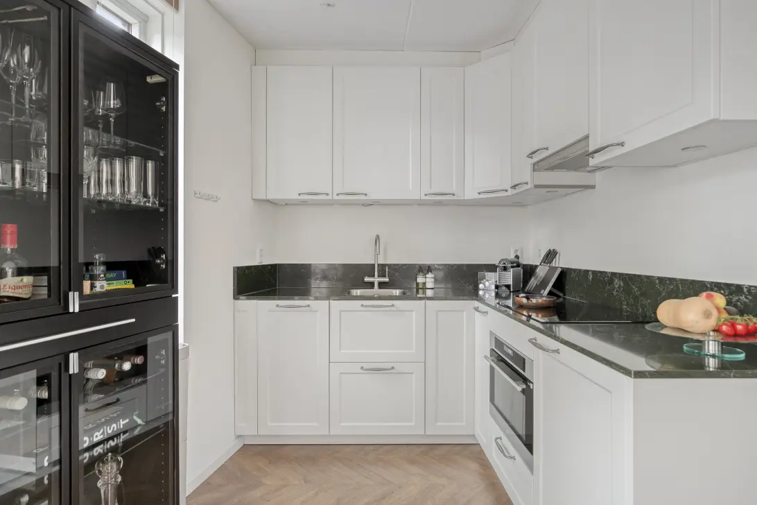 De woonkamer is ruim en licht, met een zithoek waar je comfortabel kunt ontspannen en televisie kijken, en een kook- en eetgedeelte. Vanuit de woonkamer is er tevens toegang tot een buitenruimte, ideaal voor een moment van rust of een frisse start van de dag. De open keuken grenst aan het eetgedeelte en is functioneel ingericht, waardoor het appartement efficiënt en comfortabel is ingedeeld.