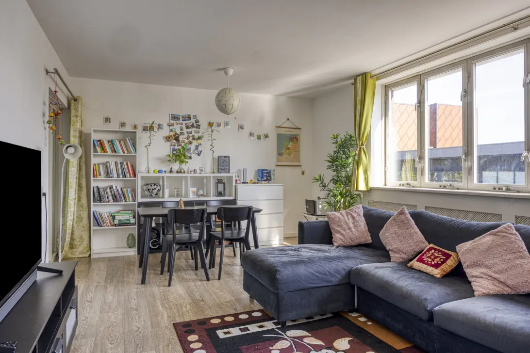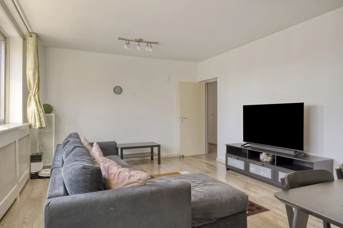 Wauw, wat een heerlijk lichte ruimte! Er valt aangenaam veel daglicht naar binnen door de ramen aan twee zijden en de deur naar het balkon. Je hebt meer dan genoeg plek voor het creëren van een knusse zithoek en een gezellige eethoek waar je heerlijk kunt tafelen. De woonkamer is netjes afgewerkt met een laminaatvloer en strak gestucte wanden in een lichte kleur. Weet jij al hoe je het gaat inrichten?