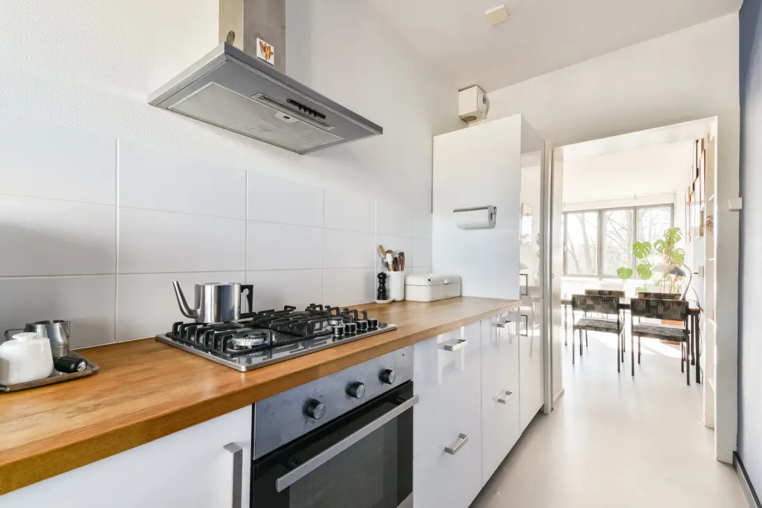 From the living room you have access to the kitchen. The kitchen and living room can be separated by a sliding door, allowing you to choose between an open-plan layout or a more enclosed kitchen. The kitchen is equipped with a built-in oven, a four-burner gas stove and a refrigerator and freezer.