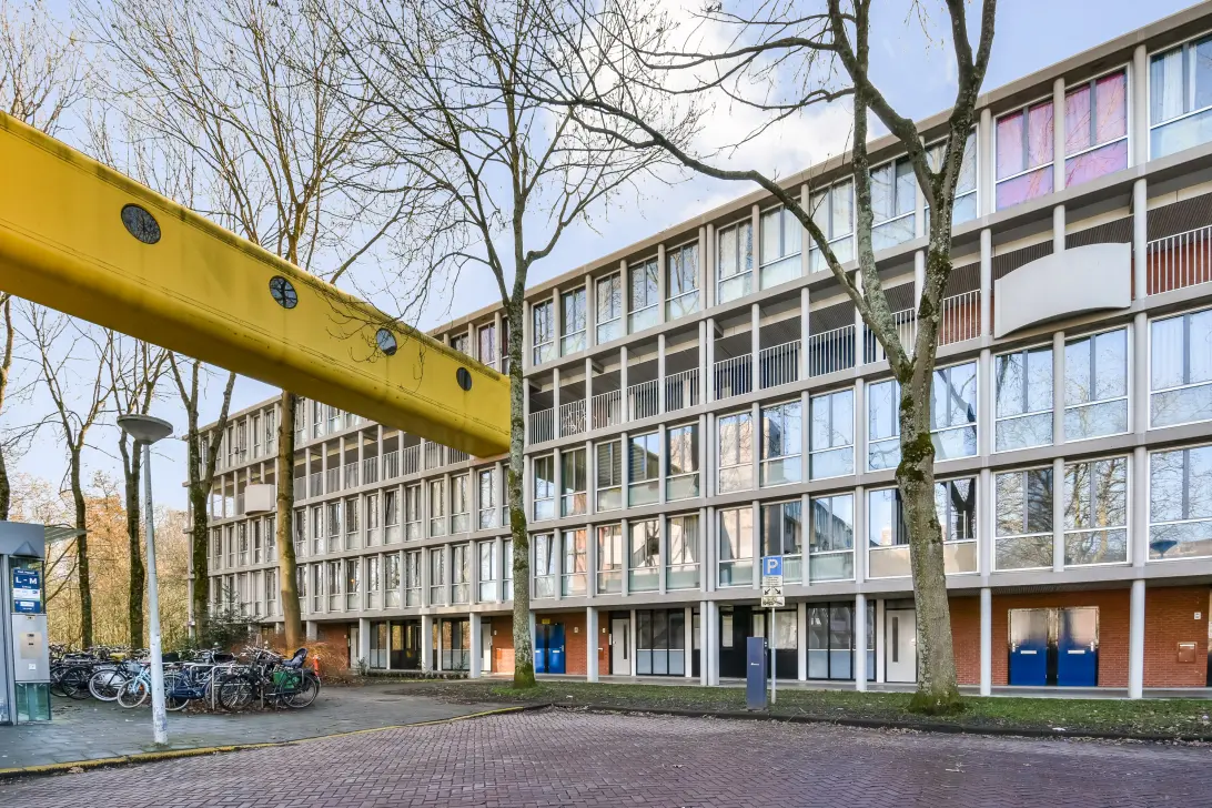 The apartment is located in the quiet and family-friendly neighborhood Het Breed in Buikslotermeer, a green and spacious residential area. The neighborhood is also known as Plan Van Gool, named after architect Frans van Gool. In 2024 it was designated as a municipal protected cityscape due to its innovative urban design and futuristic architecture. The residential blocks are connected by elevated walkways, which together with the internal galleries on the third floor create an additional route through the neighborhood, the so-called “streets in the sky”.