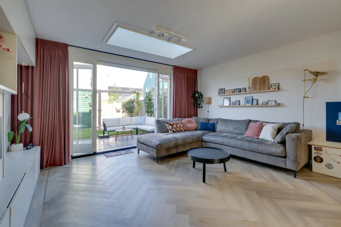 De lichte woonkamer is een ware blikvanger, met openslaande deuren naar de zonnige achtertuin die zorgen voor een naadloze overgang tussen binnen en buiten. Dankzij de lichtkoepel stroomt het daglicht binnen, waardoor de ruimte heerlijk helder is. De woonkamer is zeer fraai afgewerkt met gestuukte wanden en plafonds en een prachtige pvc visgraatvloer.