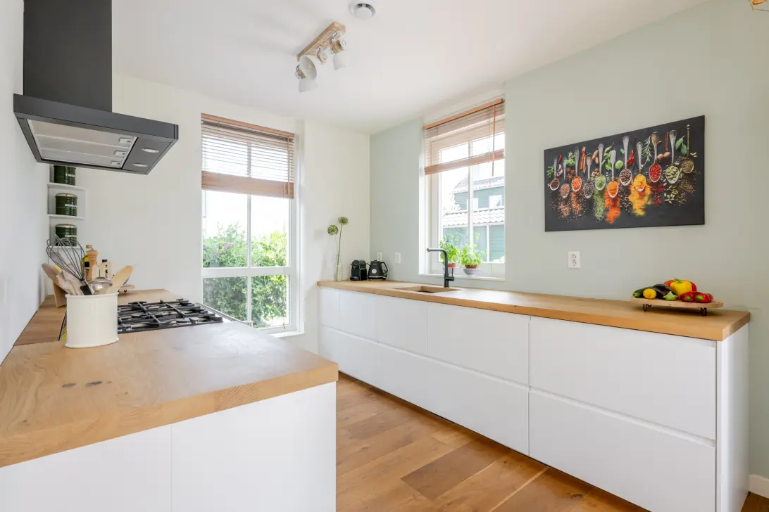 Via de hal, met luxe toilet, kom je in de royale woonkamer met houten vloer en openslaande deuren naar het terras. De lay-out van het huis is leuk ontworpen met een halfopen zitkamer en een ruime woonkeuken. Wat ook opvalt: het is heerlijk licht in huis. Dat is te danken aan de gunstige ligging op het zuidwesten, maar ook aan de vele hoge ramen en de lichte afwerking.