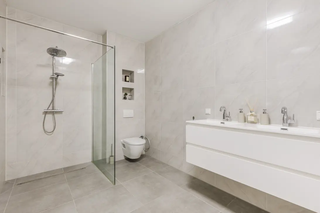 De royale badkamer heeft een centrale ligging op deze verdieping en is afgewerkt met grijze vloertegels en lichte marmerlook wandtegels. De ruimte straalt luxe uit en is uitgerust met een zwevend toilet, een badmeubel met dubbele wastafel en een inloopdouche met zowel een regen- als handdouche.