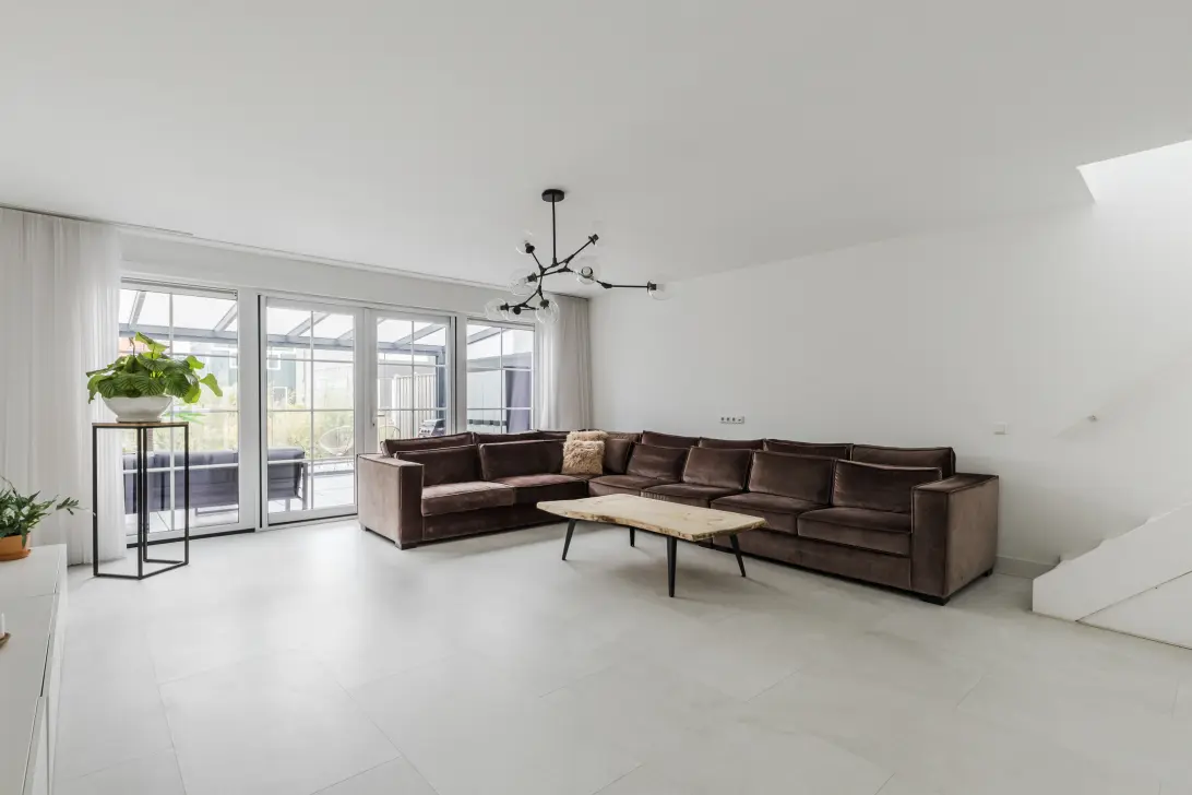 De royale woonkamer is afgewerkt met een schitterende vloer en glad stucwerk op de wanden. Dankzij de hoge ramen aan de voorzijde en de brede raampartij met openslaande deuren aan de achterzijde, voelt de woonkamer heerlijk licht en ruimtelijk aan. Centraal in de woonkamer bevindt zich de trap naar de eerste verdieping.
