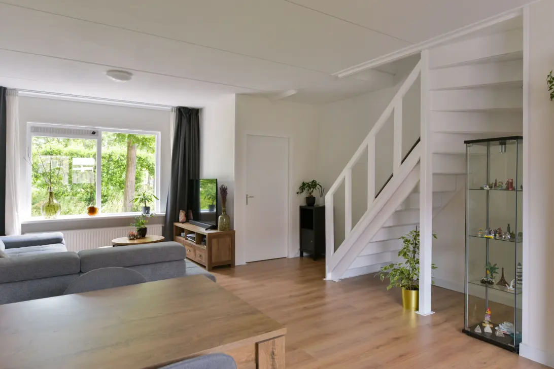 Binnen stap je in een lichte woonkamer met vrij uitzicht. Aan de achterzijde vind je een zwarte keuken met uitzicht over de tuin. Een zonnige achtertuin en dus een heerlijke plek voor een ontspannen momenten in de zon, knusse borrelavonden of een goed boek in alle rust. De stenen berging is perfect voor fietsen, gereedschap of hobbyspullen.