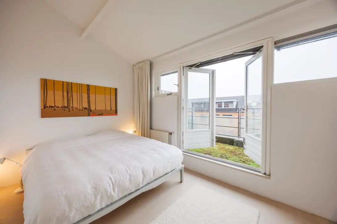 Royale slaapkamer met openslaande deuren naar het brede (sedum)dakterras/balkon op het zuidwesten. Daarnaast bevindt zich hier een afsluitbare bergruimte met tevens de aansluiting voor wasmachine en droger, en de opstelplaats van de CV-combiketel (HR-combiketel d.d. 2019).