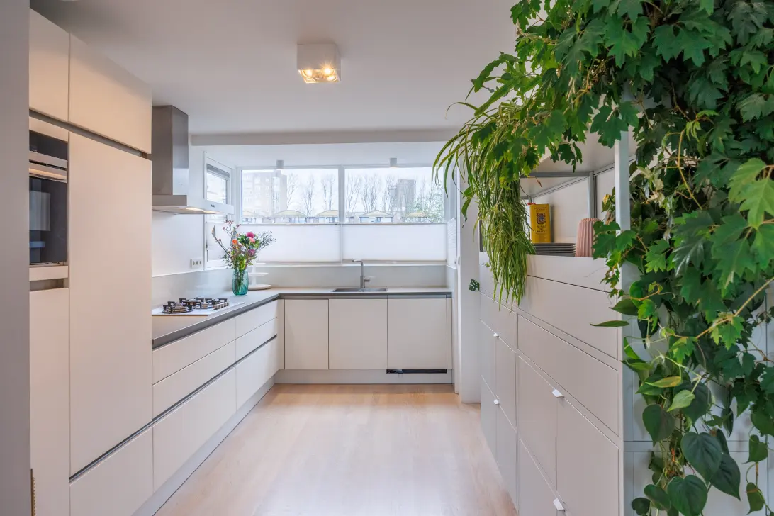 Aan de voorzijde bevindt zich de ruime keuken met een moderne inrichting en een erker. De keuken is strak modern uitgevoerd en voorzien van kwalitatief goede inbouwapparatuur.