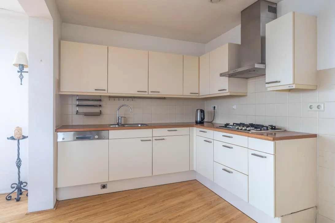 De halfopen keuken is ruim opgezet en voorzien van een vaatwasser en een 4-pits gasfornuis met afzuigkap. Vanuit de keuken heeft u tevens toegang tot de inpandige berging.