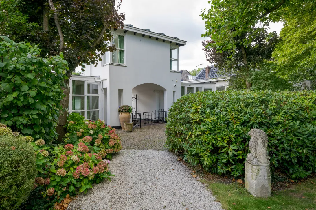 Nadat je het elektrische hek van het poortgebouw achter je hebt gesloten waan je je direct in een andere omgeving en komt de rust over je heen. Een centraal gazon met eeuwenoude plataan (1820) vormt het hart van de binnentuin. Bijzonder is de kas met mandarijnenboom naast de boom, waar je op een zonnige dag in hartje winter nog heerlijk kunt zitten. Zowel links als rechts van het gazon loopt een grindpad, waar je eventueel met de auto direct voor het huis kunt komen. Nu zijn er enkele hoekjes en zitjes waar je op verschillende momenten van de dag kan genieten van zon of schaduw. Iets verderop ligt een vijver die van een waterleidingsysteem met Rijnwater is voorzien, met daarachter de entree van de woning, links geflankeerd door een veranda en rechts een zonrijke serre. Ook hier zijn het alle jaargetijden genieten van deze grote tuin.
