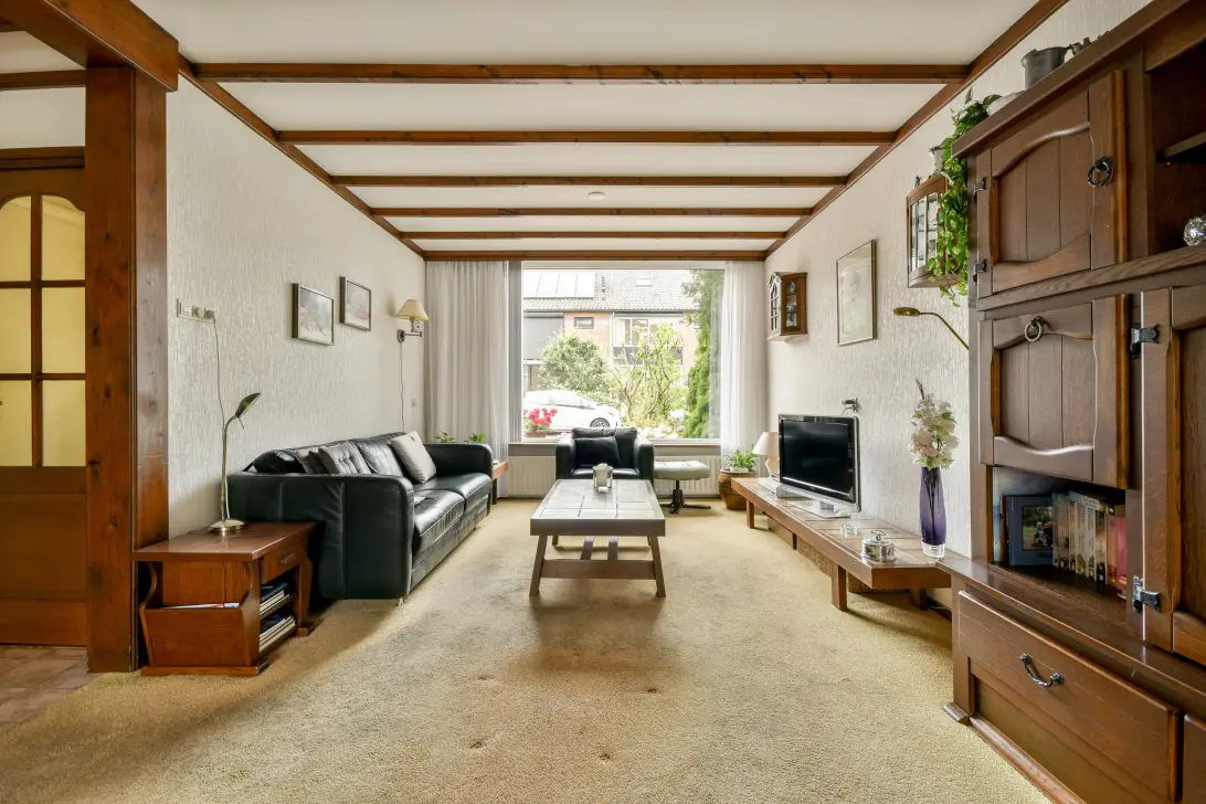 The living room with open kitchen can be entered from the hall with toilet, meter cupboard and staircase cupboard. The living room is wonderfully spacious due to the extension at the rear. The kitchen was modernised approximately 7 years ago and has wall units, deep drawers, a fridge/freezer, a 4-burner gas hob, an extractor hood, a convection oven and a dishwasher. The utility room is accessible from the kitchen where the connections for the washing machine are present. The garden is accessible from the utility room.