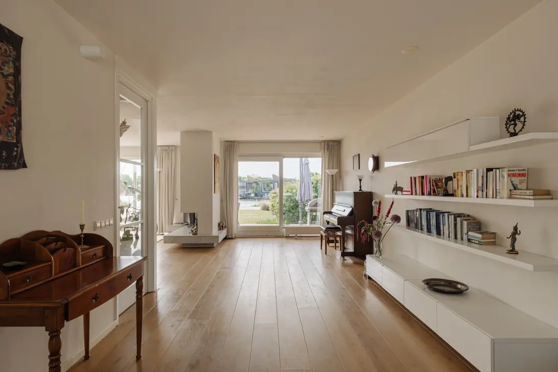 At the front of the house, the bright living room is located, complete with a charming gas fireplace and double French doors leading to the terrace and west-facing garden. From here, you can take in breathtaking, unobstructed views of the wide waters and the expansive polder landscape. The front garden is beautifully landscaped and includes a private dock. The entire ground floor is finished with a stylish wooden floor.