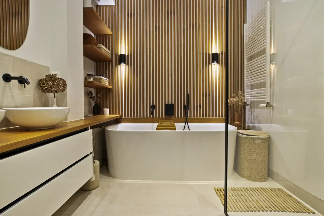 Modern toilet met fonteintje, sfeervolle badkamer uitgevoerd in natuurlijke materialen en kleuren voorzien van dubbele wastafel en meubel met laden, ligbad, douche en handdoekradiator.