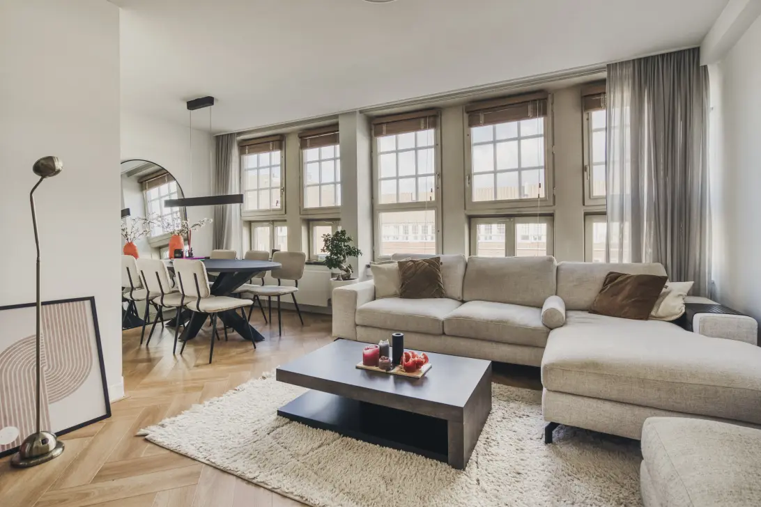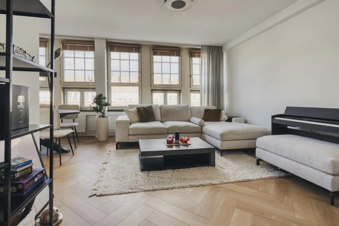 De woning bevindt zich op de hoogste woonlaag met de prachtige raampartij aan de voorzijde, die zorgt voor de prachtige lichtinval. Oorspronkelijk beschikte de woning over vier kamers; momenteel zijn het er twee, waardoor er een royale en open leefruimte is ontstaan – met eenvoudig de mogelijkheid om weer extra kamers te creëren.