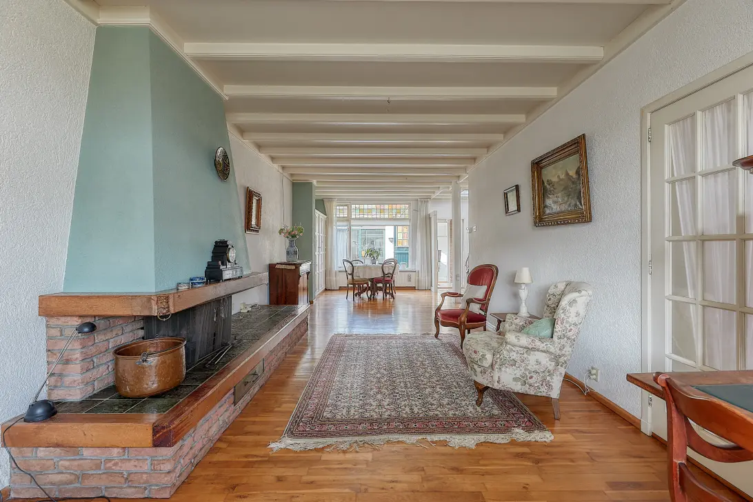 Through the entrance, you reach the hallway with a staircase cupboard and a spacious toilet. The extended living room is wonderfully bright and features a characteristic bay window with stained glass, a fireplace, and an attractive beamed ceiling. At the rear, you will find the open kitchen.