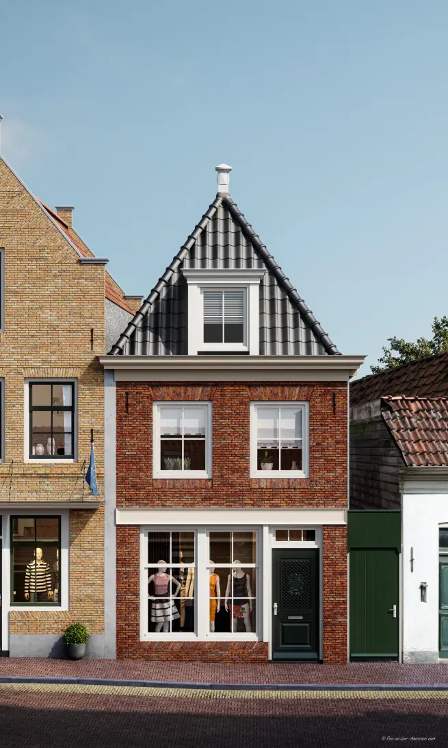 Het zadeldak met dakkapel zorgt voor een klassieke uitstraling van het pand. Deze dakkapel geeft extra ruimte op de bergzolder die gesitueerd is op de tweede verdieping. De klassieke voordeur geeft grandeur aan de privé entree. Kijk vanuit de woonkamer richting de Baanbrug en de bootjes in de Nieuwe Haven.